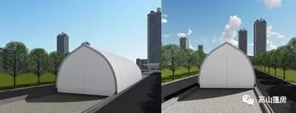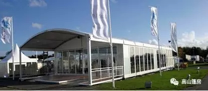 傳統人字形篷房因為大量使用,容易產生審美疲勞。高山弧形篷房從人字篷房改進而來,外觀更像膜結構建筑,輔以飄檐看臺和新型雨搭,整體營造出飄逸美感,適用于體育比賽和高爾夫球場。