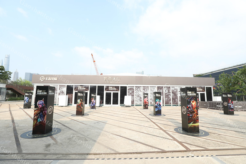 原來,高山的平頂篷房采用8°仰角,先進(jìn)的漲緊系統(tǒng)取代了雙層吹氣設(shè)計,配以新型材料做平行布幔,加上帶有王者榮耀logo的圍欄,整體形成平頂效果,怎么樣?有沒有成功騙過您的眼睛?